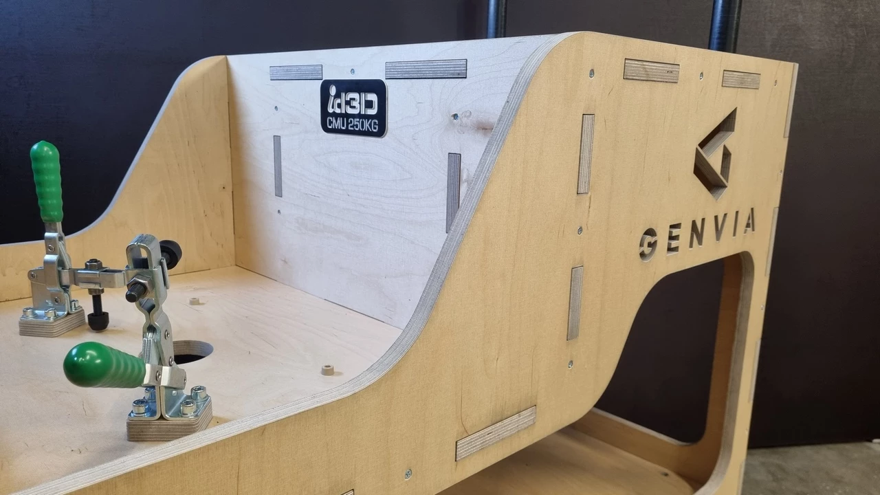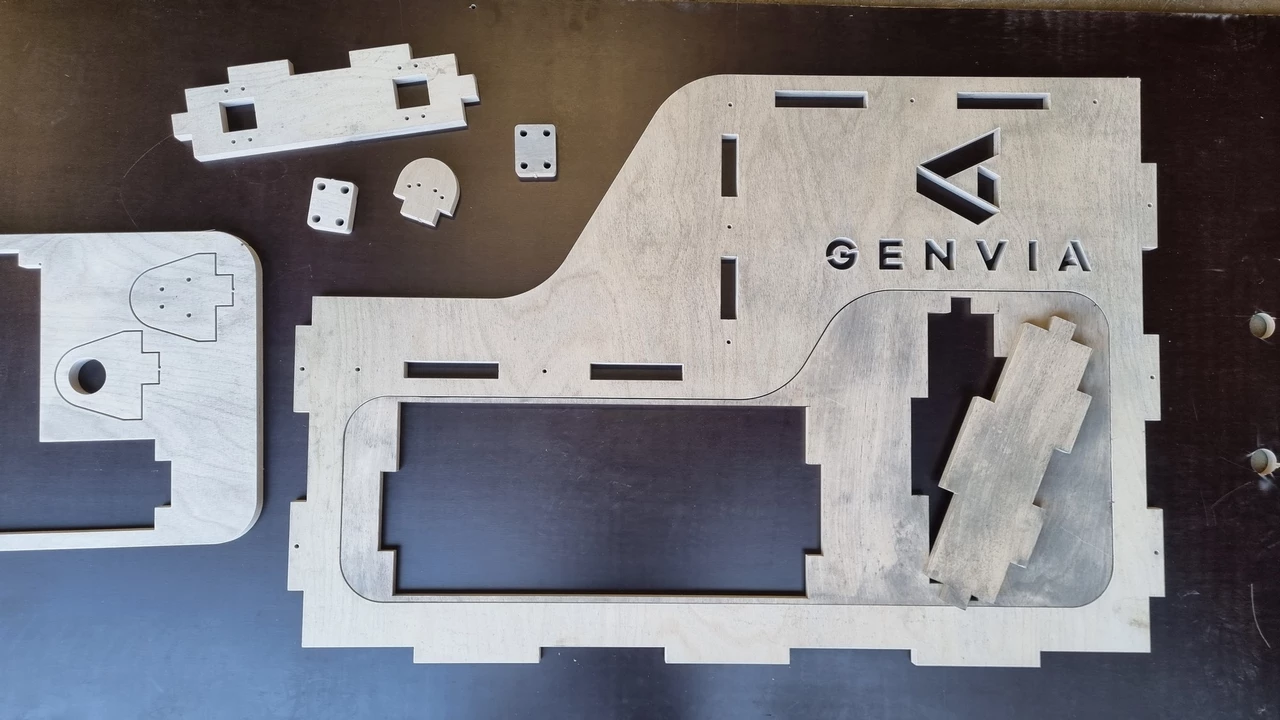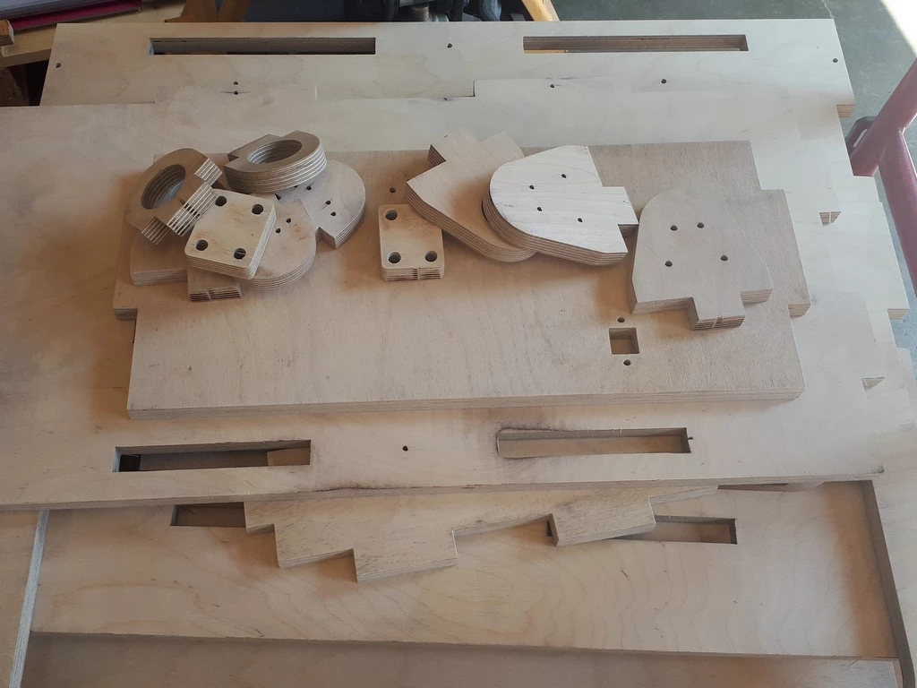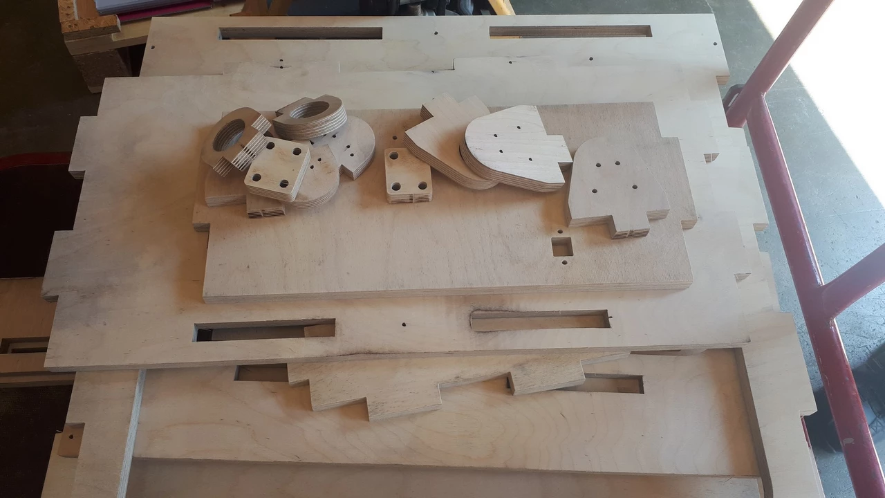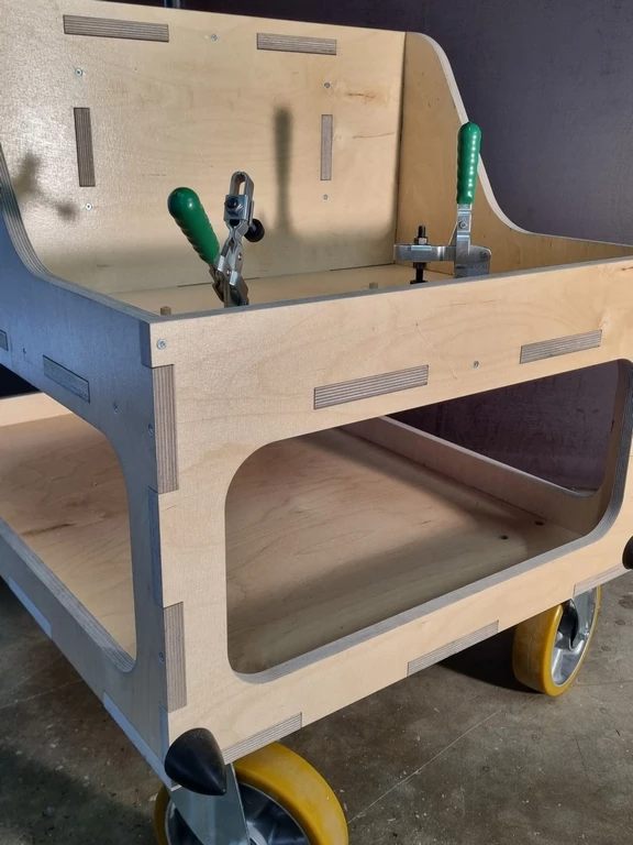 L’ensemble de la structure du chariot est réalisé en contreplaqué, usiné sur notre machine à commande numérique, puis assemblé à l’aide de tenons-mortaises, avec un minimum de vis.