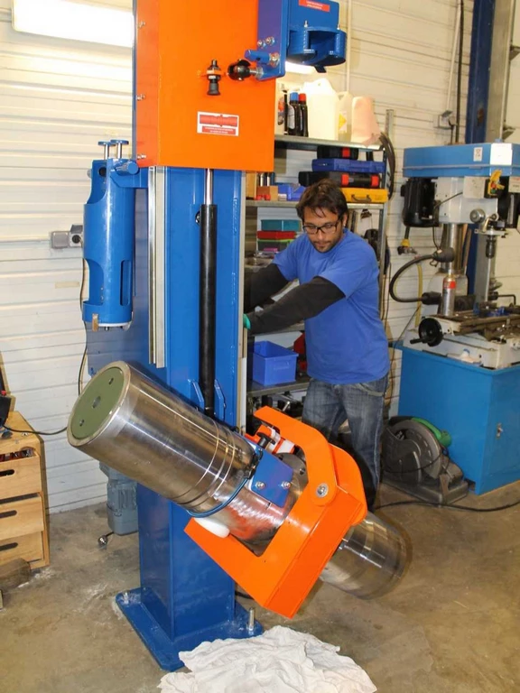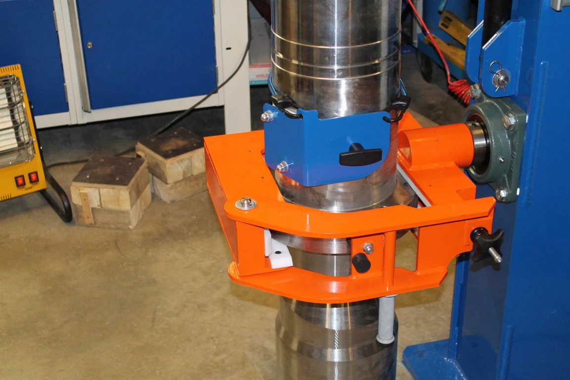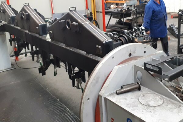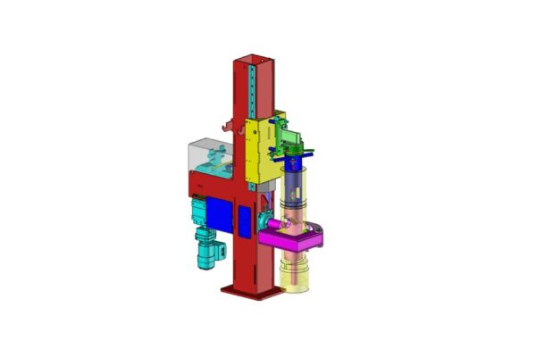 Développé par notre bureau d’études mécaniques, cet outillage industriel automatisé permet de pivoter des pièces de 200 kg pour y insérer un piston par action verticale.