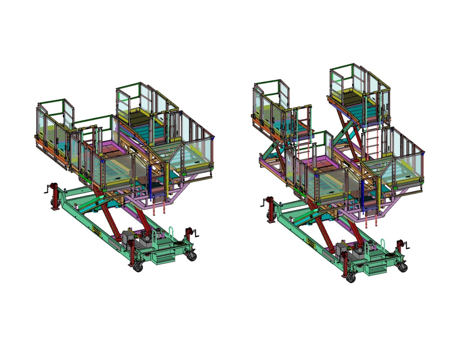 Grâce à ce système, la hauteur de plancher peut passer d’environ 1 mètre à plus de 4,5 mètres déployés, offrant une multitude de configurations de travail. Conçu selon la Directive Machine 2006-42 CE et la norme NF EN 280 – Plates-formes élévatrices mobiles de personnel, ce projet intègre toutes les sécurités nécessaires : procédure de certification CE de type, mécanisme de descente de secours, détection de surcharge, double pupitre de commande, affichage de la CMU et patins stabilisateurs.