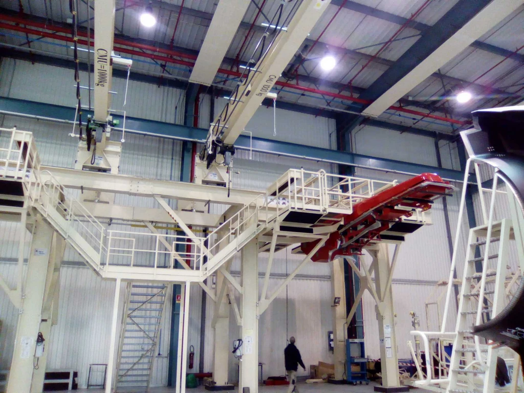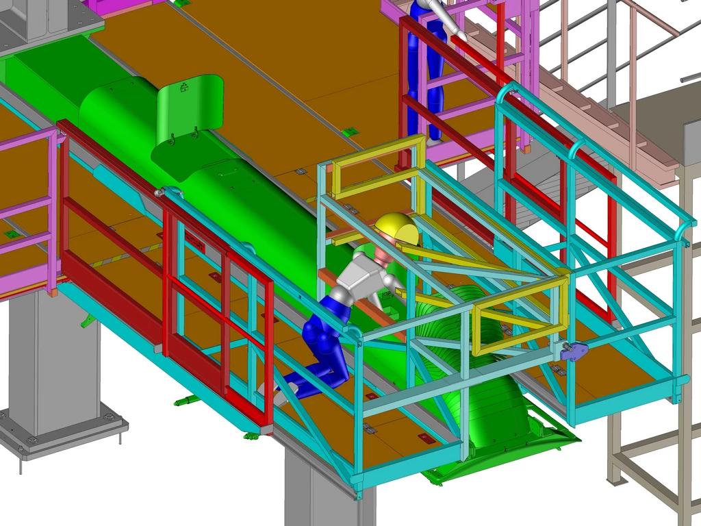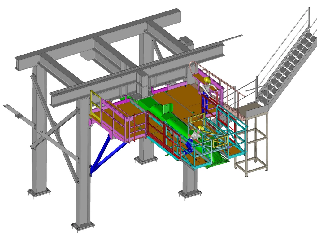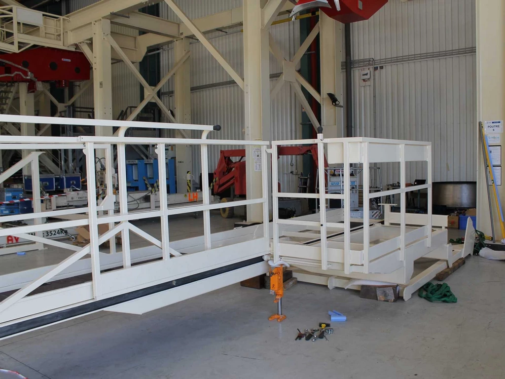 Le projet se compose de quatre plateformes coulissantes à grande extension, offrant une course maximale de 3 300 mm en porte-à-faux. Équipées de garde-corps télescopiques et d’un plancher à trappes, elles permettent aux opérateurs de réaliser le montage des capots moteurs en toute sécurité, avec un accès optimal aux zones de travail.