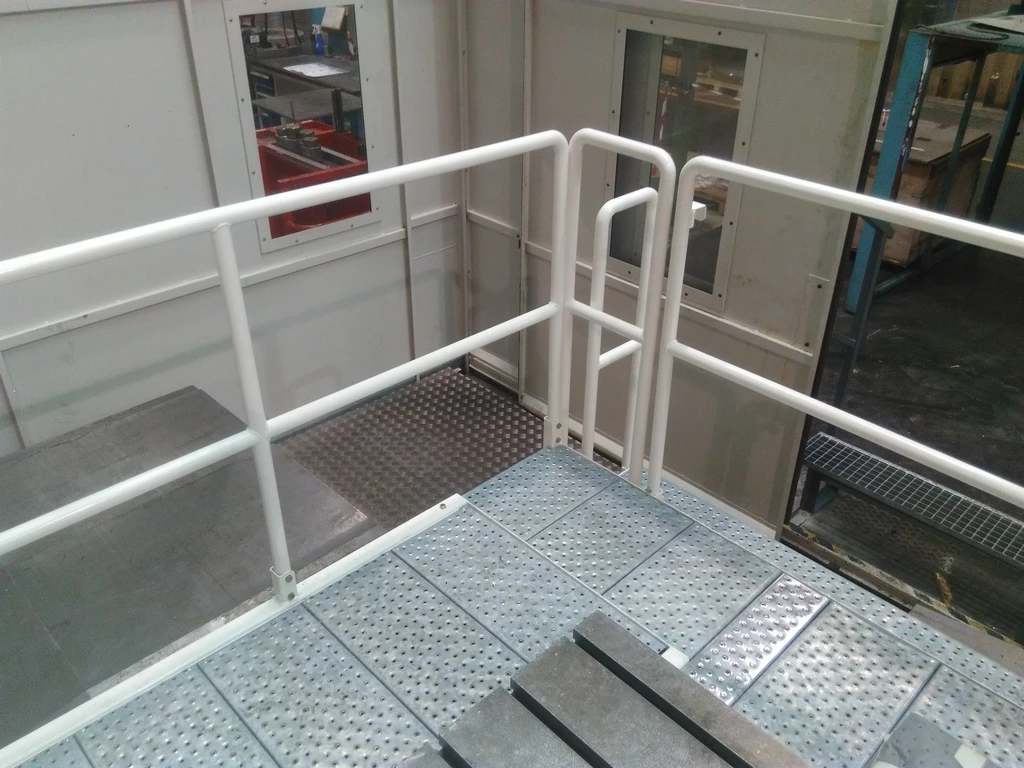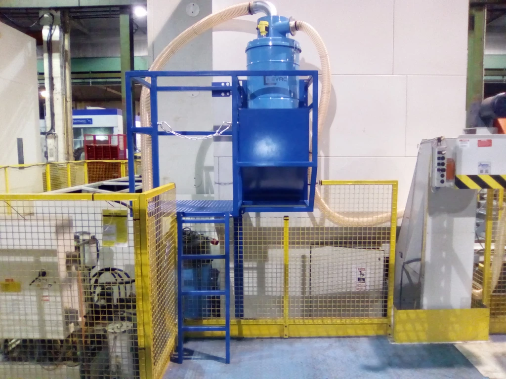 Plateforme montée sur chariot mobile, équipée de garde-corps rabattables pour sécuriser le travail dans une machine de sablage.