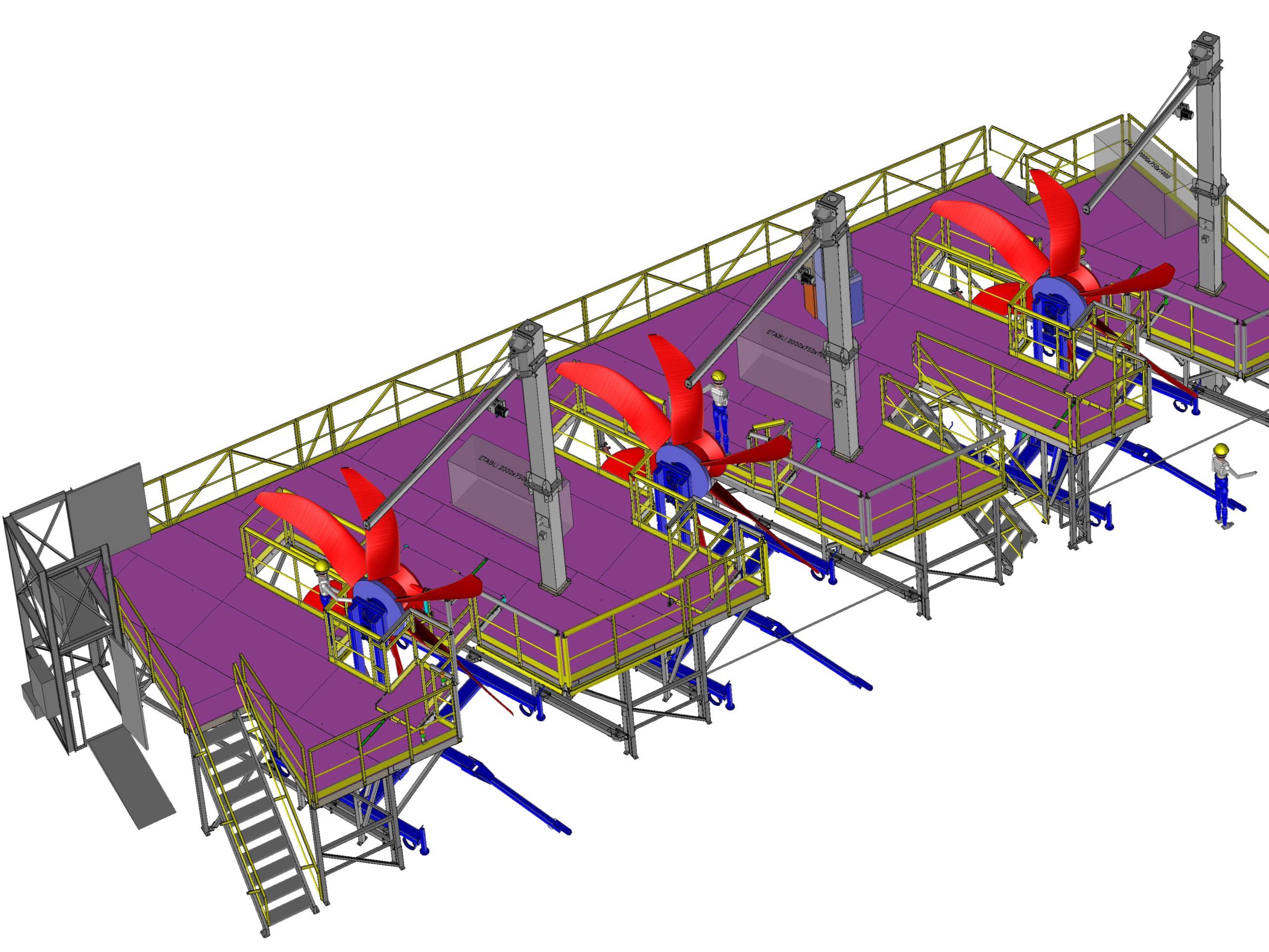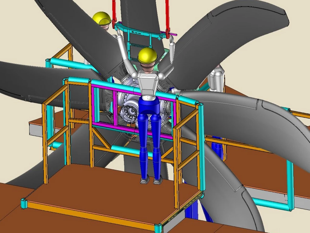 La mise en place des hélices s’effectue à l’aide d’un chariot roulant spécifique. Pour la sécurité, des garde-corps coulissants interdisent l’accès à la zone tant que l’hélice n’est pas installée, réduisant ainsi tout risque de chute.