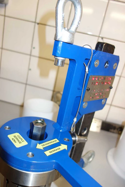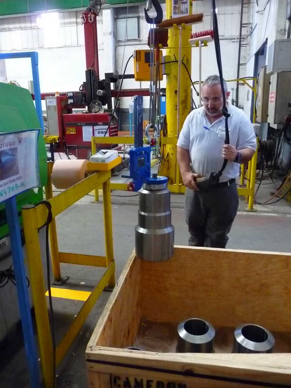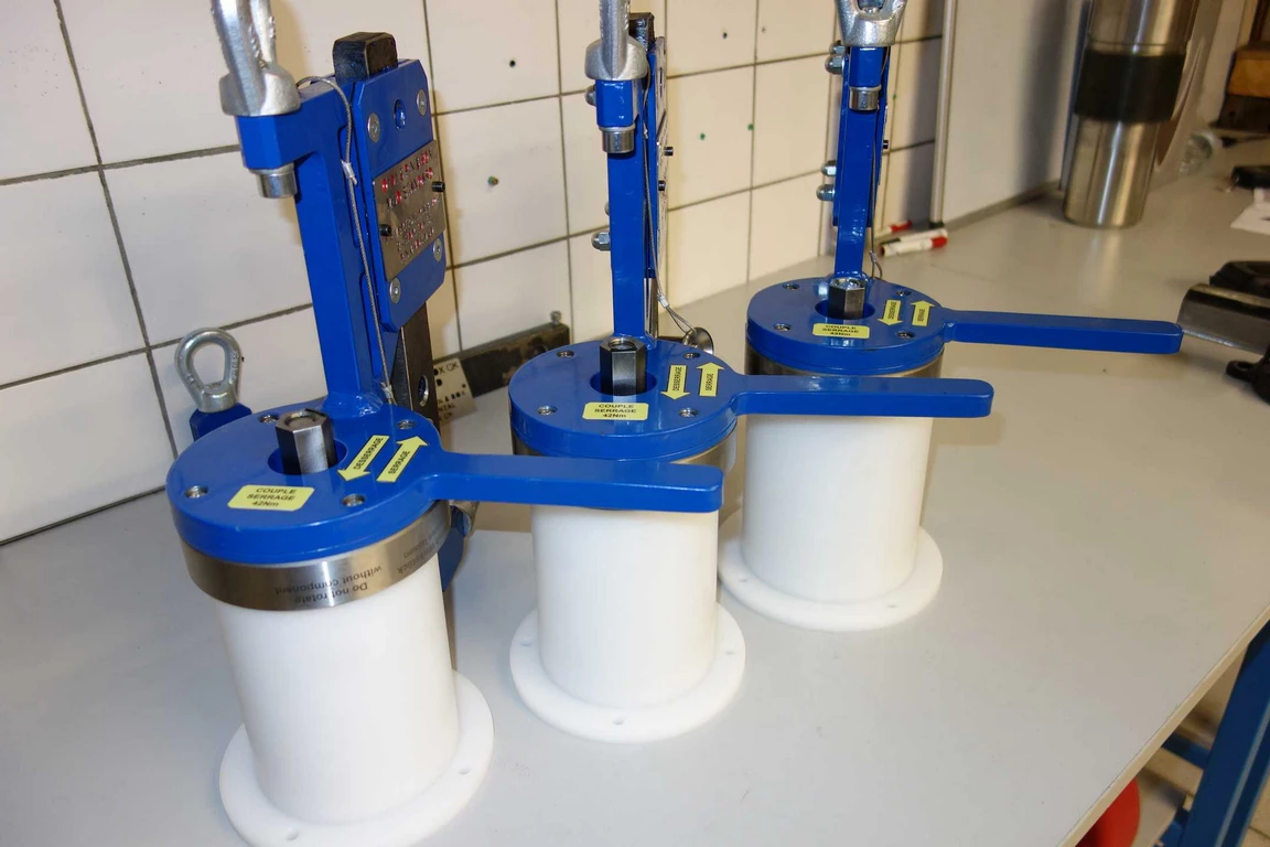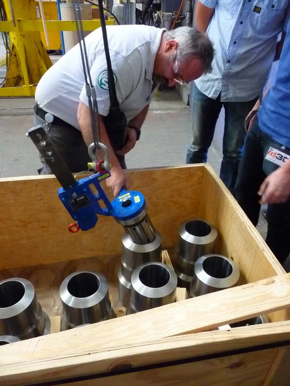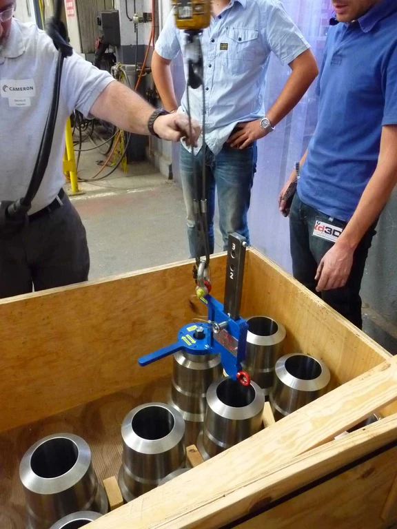 Un système ingénieux basé sur un mandrin à expansion permet de saisir une pièce métallique directement sur une palette. Lors du serrage, l’adhérence permet de lever la pièce en toute sécurité, là où les manipulations étaient jusqu’alors fastidieuses et chronophages. - Outil de levage de bride pétrolière