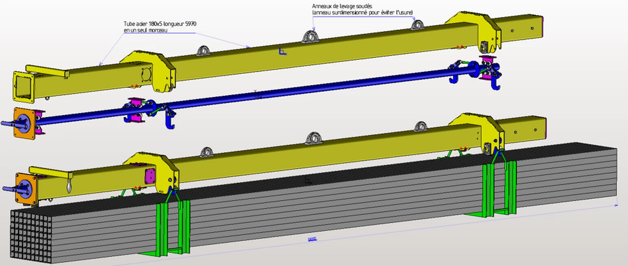 Les projets présentés ici illustrent notre capacité à concevoir des palonniers sur mesure, pensés pour un usage bien défini et souvent unique. Ils peuvent aussi être bien plus complexes à l’image de ce palonnier mécanisé pour barrages flottants