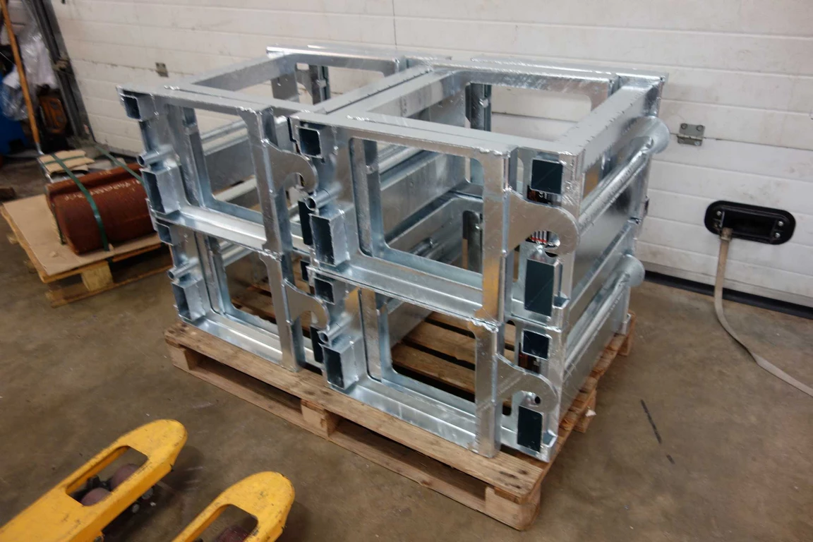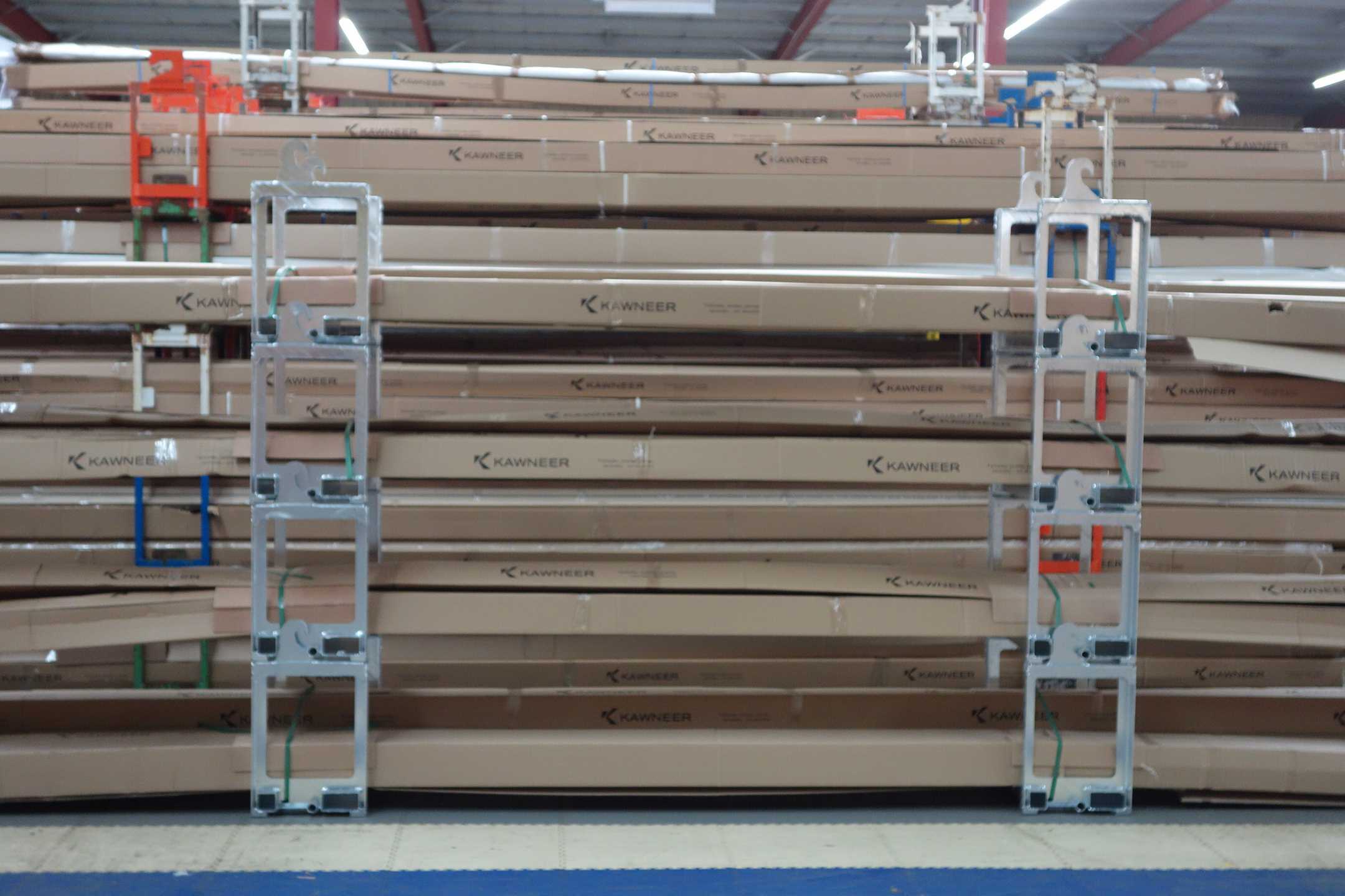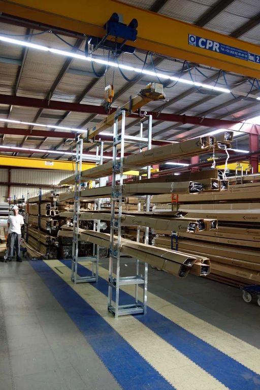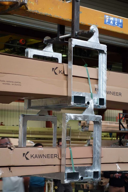 Les berceaux en forme de U s’utilisent par paire pour manipuler des profilés aluminium de 6 mètres dans une usine de production. Ils peuvent être levés via un pont roulant équipé d’un palonnier ou manipulés à l’aide d’un chariot élévateur.