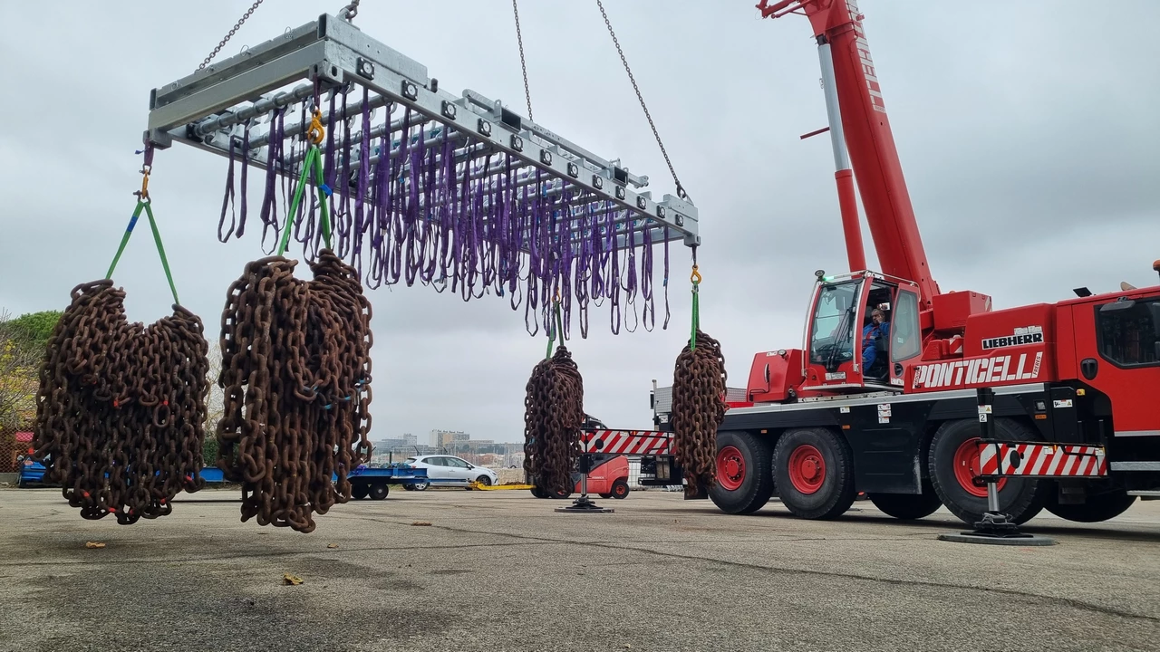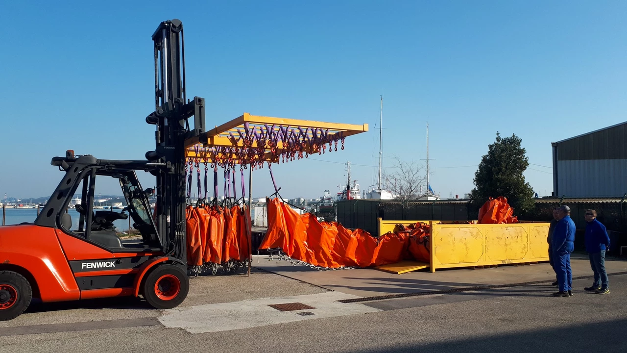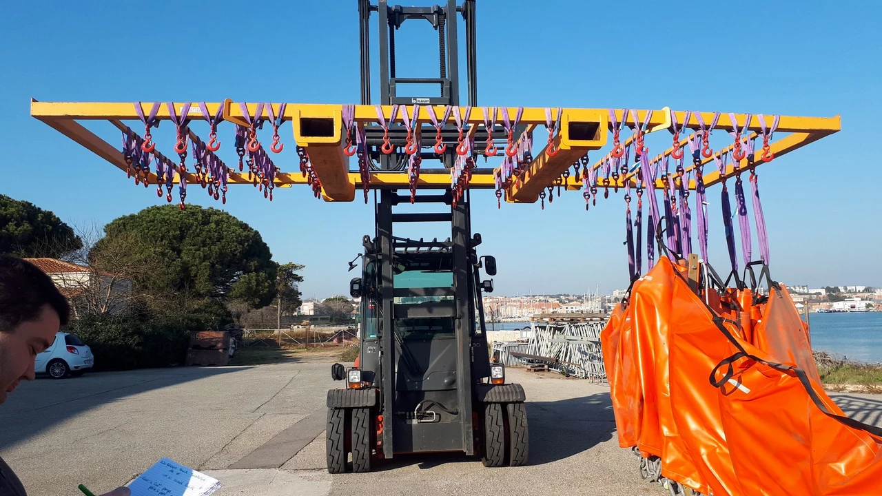 Ce palonnier de levage sur mesure permet la manutention de barrages flottants utilisés dans la lutte anti-pollution maritime.