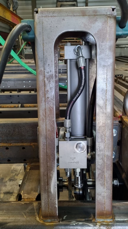 La rotation des crochets est assurée par un vérin hydraulique qui actionne une bielle et une barre de transmission.